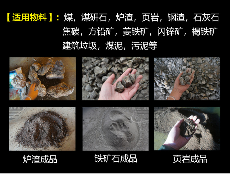【適用物料】:河卵石、方解石、石英石、大理石、鵝卵石、膨潤土、鐵礦石、青石、山石、水渣、石灰石、風化砂、輝綠巖、花崗巖、玄武巖等